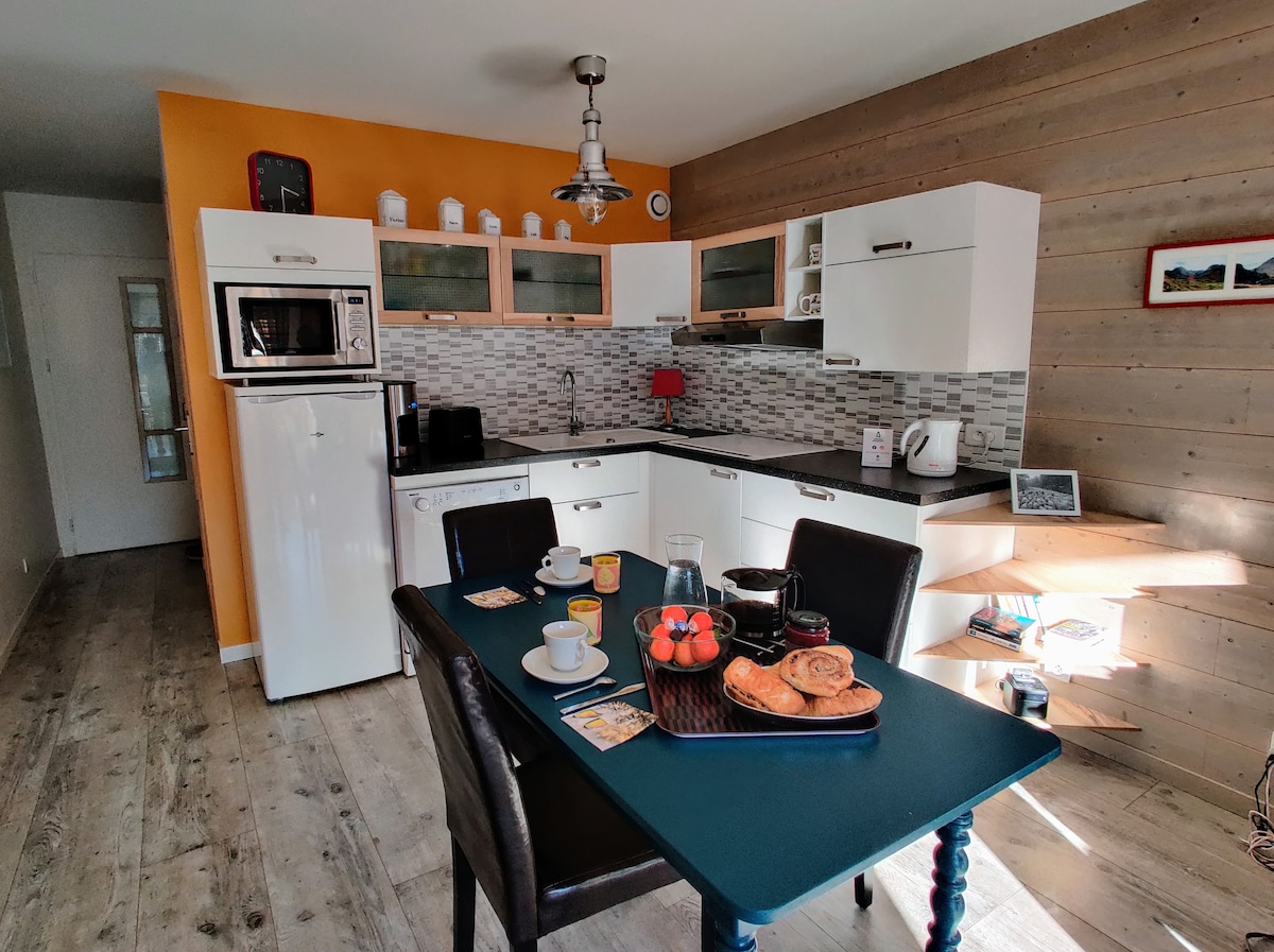 Studio cabin located residence Le Bristol (1st floor with elevator) on a quiet street next to the central square, thermal baths and ski lifts. 2 bunk beds at the entrance and a 160 X 200 sofa bed. Washer-dryer. Cellar (skis, bicycles,...) 140x65. Ideal for skiing, hiking, biking... Special spa rate (contact us). Electric car charging station at the foot of the building. No WiFi. Rated 2*.