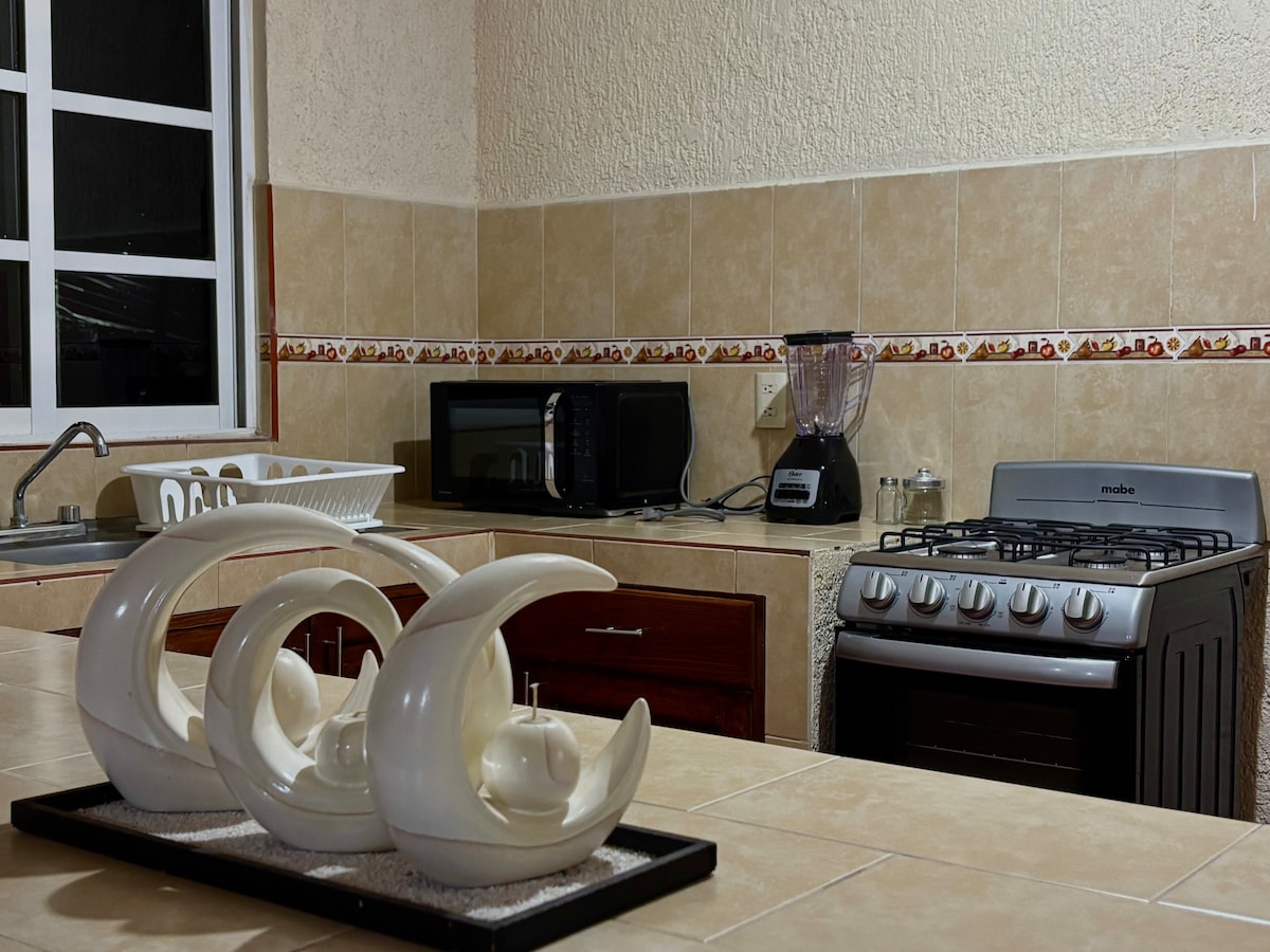 Chalet type apartment with 2 bedrooms, Kitchen, Fireplace, Air Conditioning, Smart TV, Parking, High Speed Internet. Starnet, Located at km 10.3 of the Cuetzalan-San Antonio Rayón road at the entrance to the beautiful town of Santiago Yancuictlalpan, this road is where you will find sites of great interest, at km 3 is the Xoxoktik Botanical Garden, further on at km 6 is the entrance to the archaeological zone of Yohualichan and at 14 km the Tecuantepec river.