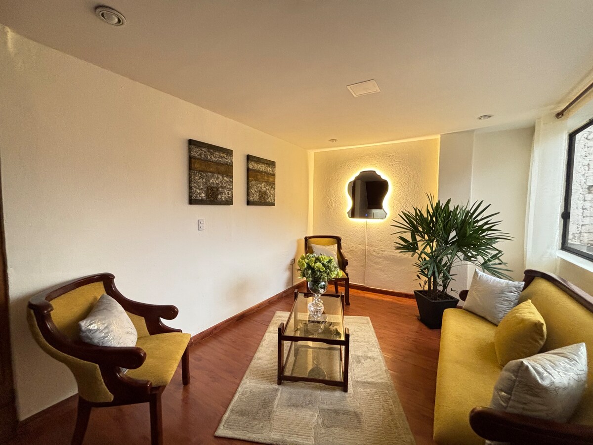 Cozy and well-equipped suite, ideal for a comfortable and quiet stay. It has a spacious bedroom, comfortable bedding, a closet with towels, a living room with a comfortable sofa bed, and a functional kitchenette with a microwave, coffee maker, and refrigerator. Clean spaces, warm lighting and wood finishes that provide a home feeling. Strategic location, perfect for resting or working comfortably. Close to the stadium, historic center, airport and shopping malls.
