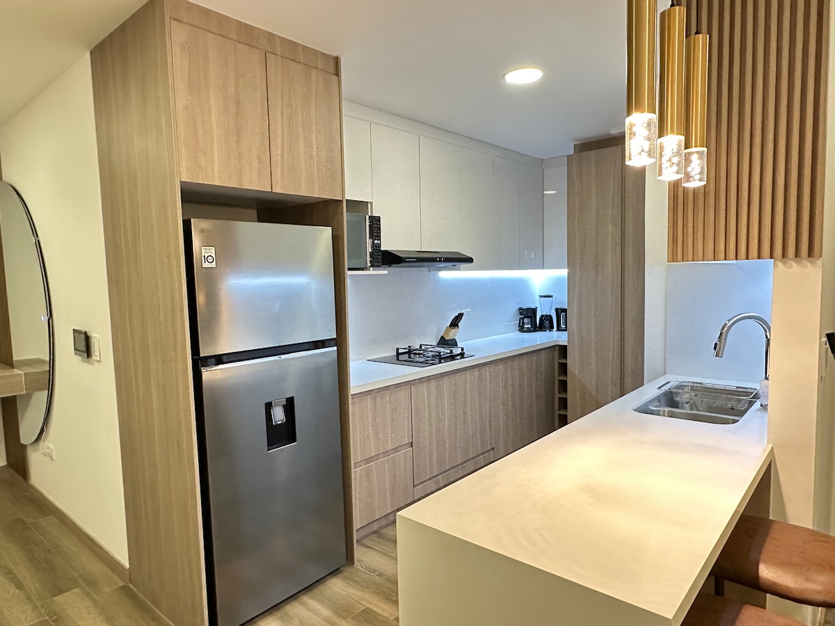 Relax in this quiet and stylish space in a quiet neighborhood in Cuenca, new apartment equipped with all necessary infrastructure, building facing the Yanuncay River, contains 360° rooftop for the city, playground, jacuzzi, sauna, close to pharmacies, gyms, and Cuenca Tram (metro).