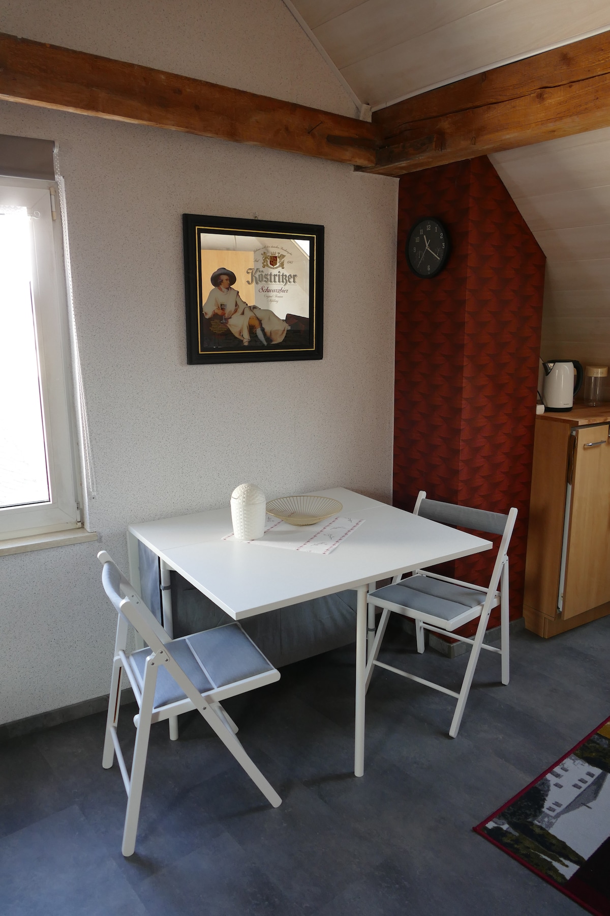 First rental in 2020 as a holiday home, in a historic courtyard ensemble. For 2 (max 4) guests, 56 m2 living space. Ground floor: hallway, living area with dining table and fireplace, sofa bed, kitchenette with oven and hotplates, original shower room. 1st floor, accessible via a spiral staircase, with attic: farmer's bed, clothes board, sofa, TV. Additional sleeping space on the gallery in the attic, via ladder. Surrounded by nature, forest paths, dream paths, Rodder Maar, Königssee, Olbrück Castle.