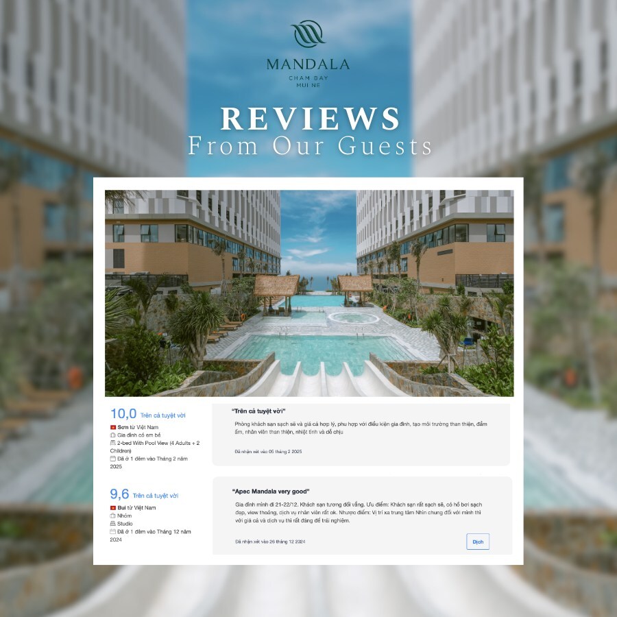 Located on the beautiful Mui Ne beach road, in the distance is a poetic, white wind turbine field, a wind power field, Mandala Cham Bay Mui Ne offers you a wonderful holiday with all the most beautiful things, from poetic scenery to comfortable life in luxurious rooms, high-class restaurants and cool infinity pools. More specifically, there are many entertainment activities, water parks, massage, spa, creating a cozy and happy atmosphere.