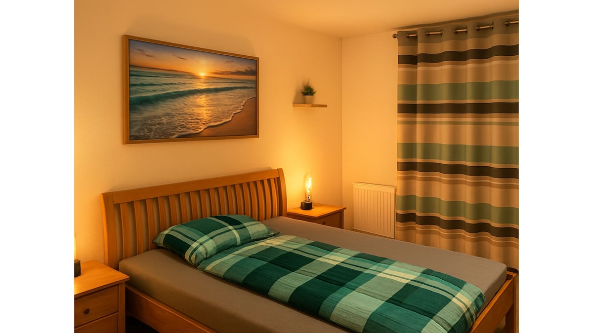 A shower as well as an extra washing facility are integrated. The special gem is our sauna, which is also located on this level. A cooking corner with a small kitchen cabinet, a hot plate, and the most important utensils are also ready for you. A few steps behind the house, a beautiful terrace awaits you for cozy, mild evenings. A staircase leads down to the stream. In the upper area is the bedroom with a double bed and the guest bed.