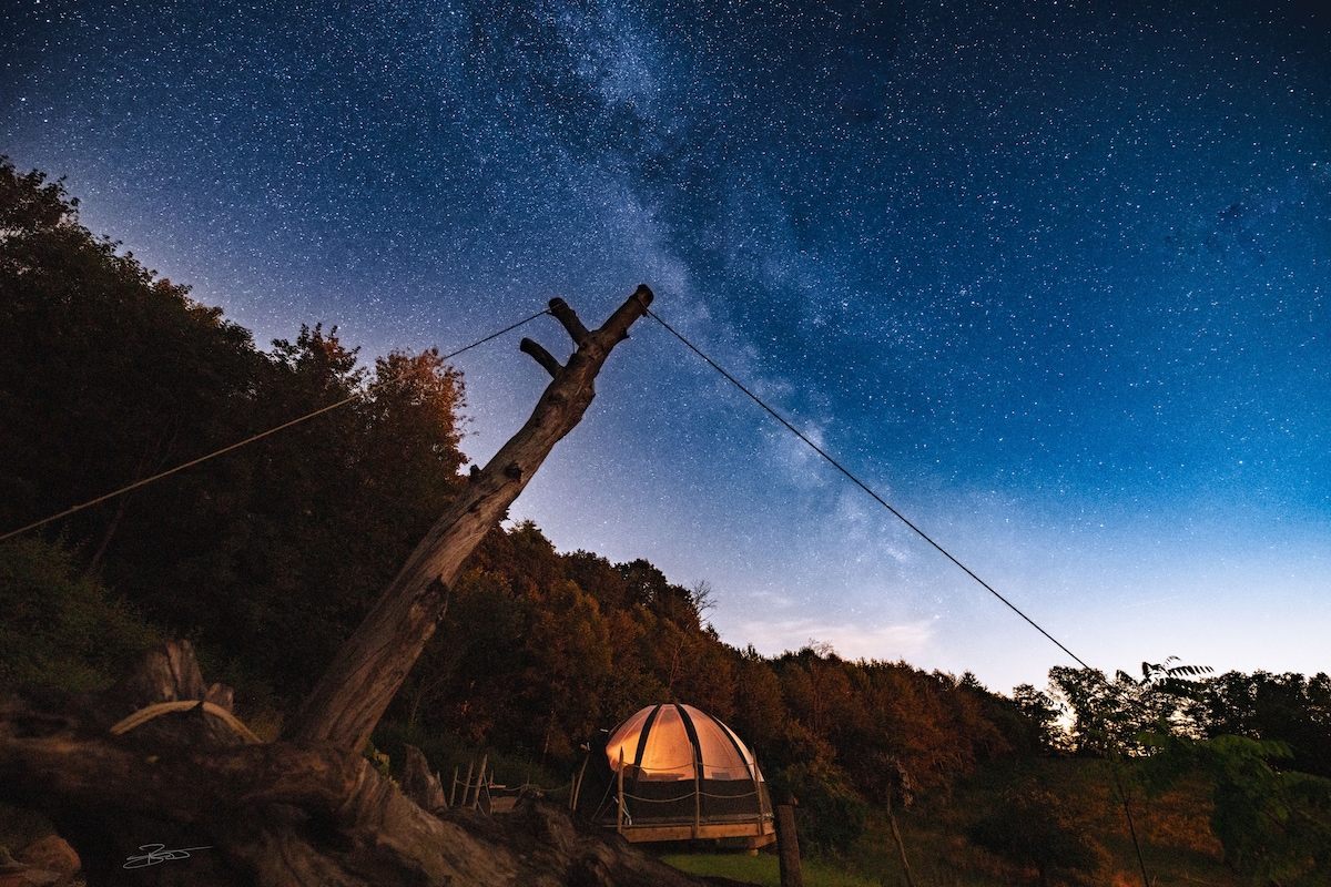 Ein außergewöhnlicher Aufenthalt an einem ganz besonderen Platz - das Bubble Tent ist am äußerst oberen Rand unseres Terrassencampingplatzes gelegen. Richte Deinen Blick in wunderschöne Sonnenuntergänge oder klaren Nächten auf das scheinbar unendliche Firmament. Ein Platz um Ruhe zu finden und diese zu genießen, eine großzügige Liegewiese und kleiner Grill laden zum gemütlichen verweilen ein. Rehe und Greifvögel kommen vorbei , hier kannst du Natur direkt erleben