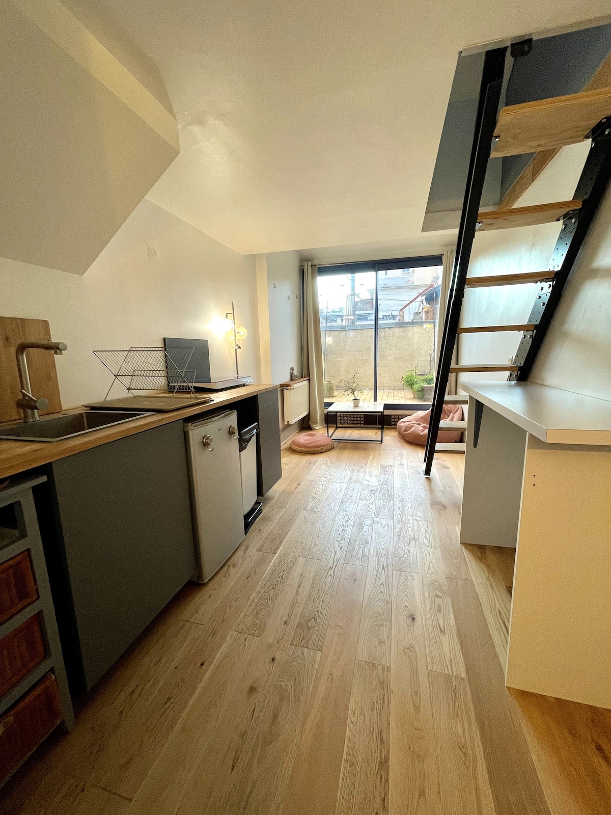 The loft is located in a former spring factory, recently refurbished by an architect. It is a duplex apartment of around fifty square metres, in a quiet, secure building with a courtyard planted with trees.