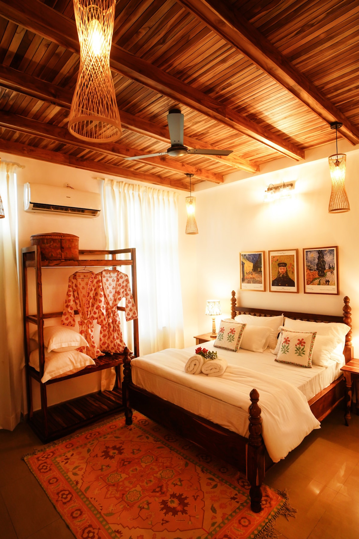 Welcome to Timber Luxe Atelier, where art, antiques, and craftsmanship meet. Featuring stunning European artworks, elegant antiques, exclusive carpets, and exquisite teak wood ceilings, this residence feels like a living gallery. Relax on the grand 10-seater sofa, enjoy movies on the 50-inch TV, or admire the warm timber interiors. Every detail, from curated paintings to carved woodwork, reflects timeless luxury. A stay here isn’t just accommodation it’s an experience.