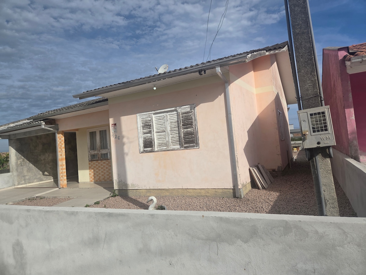 Located at Arroio do Silva, 9 meters from the center and 15 meters from Ararangua. It has two floors, with the top floor containing: two bedrooms (each with a double bed and fixed fan), a living room with a sofa bed and 2 extra double mattresses, a bathroom, glass windows and a balcony that allows you to admire the beautiful sea view. Downstairs, there is another bathroom, a kitchen with basic utensils, a living room and a sofa with TV. Fully fenced and spacious patio for parking, with a barbecue grill. We allow pets!