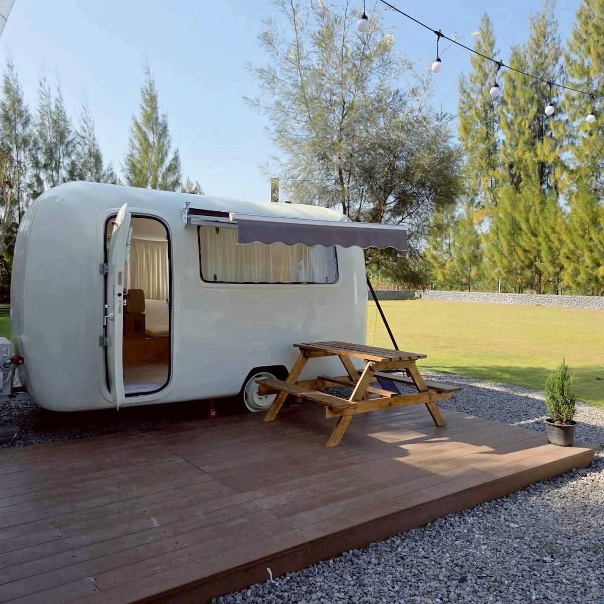 Experience the perfect blend of nomadic freedom and modern luxury. This curated outdoor space is designed for those who seek tranquility without compromising on comfort. • The Stay: A sleek, fully-equipped white caravan paired with a minimalist private annex, offering a clean aesthetic and expanded living space. • Outdoor Living: • Private Deck: A dedicated wooden platform for morning coffee