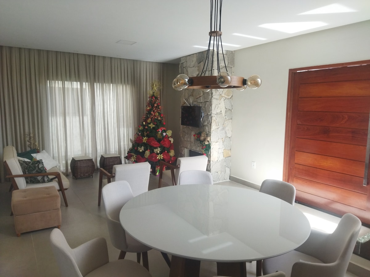 Modern, spacious house with lots of natural lighting - newly built in the Águas da Serra condominium. Quiet street and very close to the condominium's leisure area. 5 en-suite bedrooms with air-conditioning. Full kitchen. Laundry with tank and clothesline. Wi-Fi throughout the house. It has a toilet.