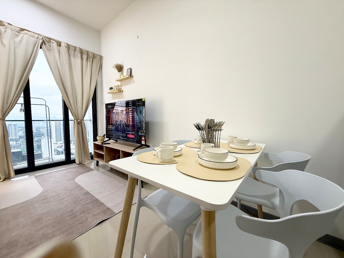 Modern 1-bedroom apartment with a private study—ideal for expats, remote workers, or small families. Enjoy a cozy bedroom, spacious living area with a 50" smart TV, full kitchen, in-unit washer/dryer, and fast Wi-Fi. The private study is perfect for working remotely or kids' homework. Located near dining and shops, this is your comfortable home base in Millerz Square, Kuala Lumpur.