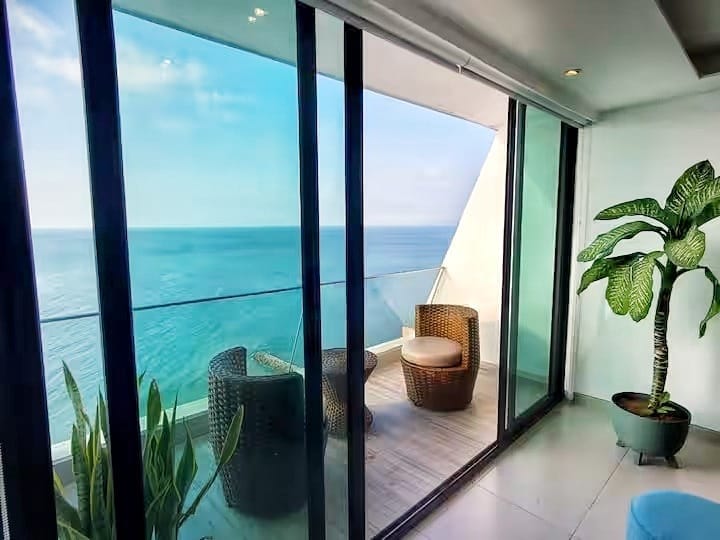Descubre el lujo y la modernidad en nuestro departamento completamente nuevo con vista al mar. Disfruta de una amplia sala de estar con ventanales que ofrecen vistas impresionantes, una cocina equipada con electrodomésticos de alta gama y un dormitorio principal con baño privado y cómoda cama Queen size. RelÔjate en la terraza privada con una cena al aire libre. Todo en un ambiente exclusivo y sofisticado. ”Vacaciones de ensueño esperan por ti!