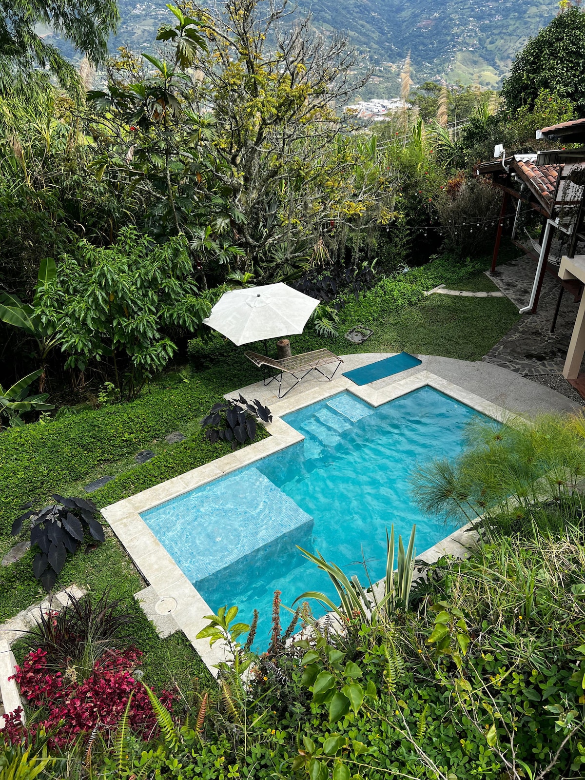 Una acogedora casa con una amplia terraza exterior con vista a la piscina y las montañas. Se pueden acomodar de 8 a 10 personas. Amplias zonas verdes. Se recomienda visitar una cascada con charco a 20 minutos caminando. Se ofrece servicio de climatización de la piscina por un costo adicional que dependerá del tiempo de uso.