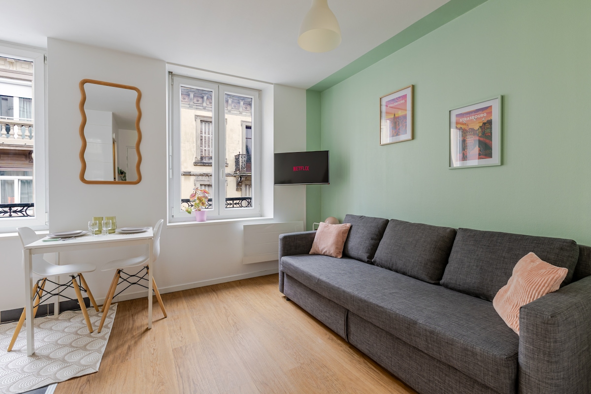 Non-smoking. 16 m2 refurbished studio, new furniture and decor, in a magnificent historic building in neo-baroque style cut stone, 5th and top floor without elevator, very quiet. Ideally located in the city center at the entrance to Petite France by the river, at the foot of the tram, and 5 minutes from the TGV train station. High ceiling, charming wooden beams. This place is perfect for couples, friends and solo travelers, unpack your bags quickly and welcome!