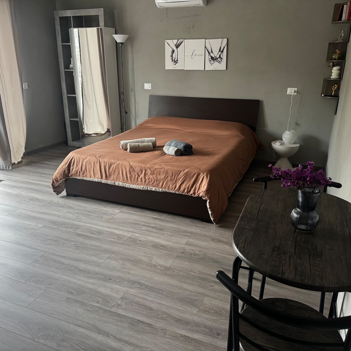 Cozy ground-floor studio in the quiet Chievo district of Verona. Features a fully equipped kitchen, double bed, and modern bathroom. Just 100 m from the bus stop to the city center (30 min). By car, the historic center, Lake Garda, and Gardaland (20 min) are easily reachable. Ideal for those looking for comfort and convenience to explore Verona and its surroundings.