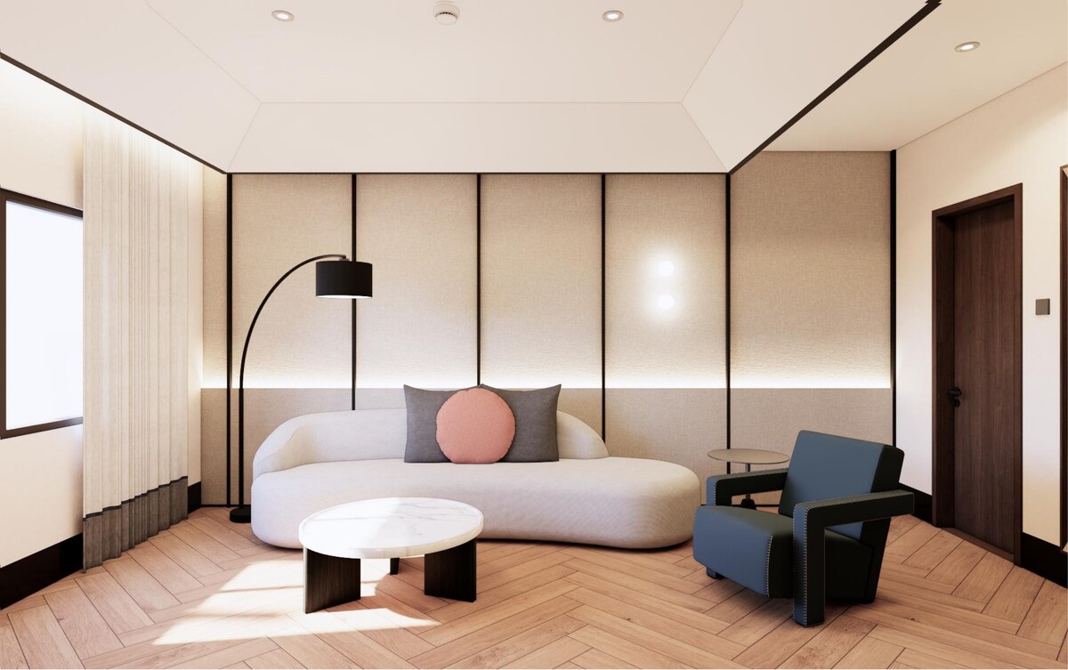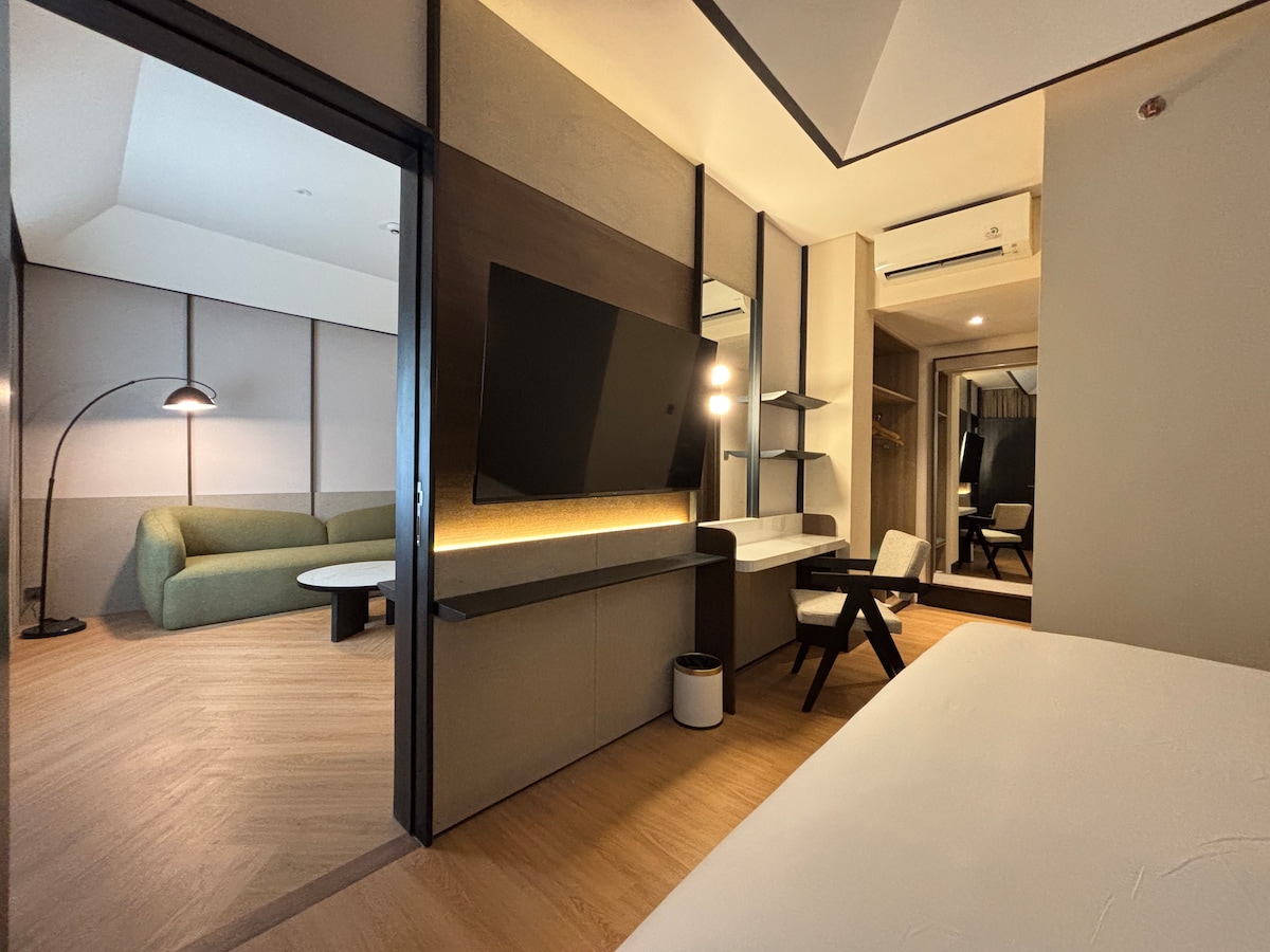 Opera Suite — Forte Suite ±48 sqm | Up to 2 Guests | King Bed A spacious suite designed for guests who prefer additional space and comfort. The Opera Suite features a separate living area, creating a more relaxed and private stay experience. Opera Suite Arrangement • King Bed (180 × 200 cm) • Separate Living Area with Three Seaters Sofa • Private Bathroom & Powder Room