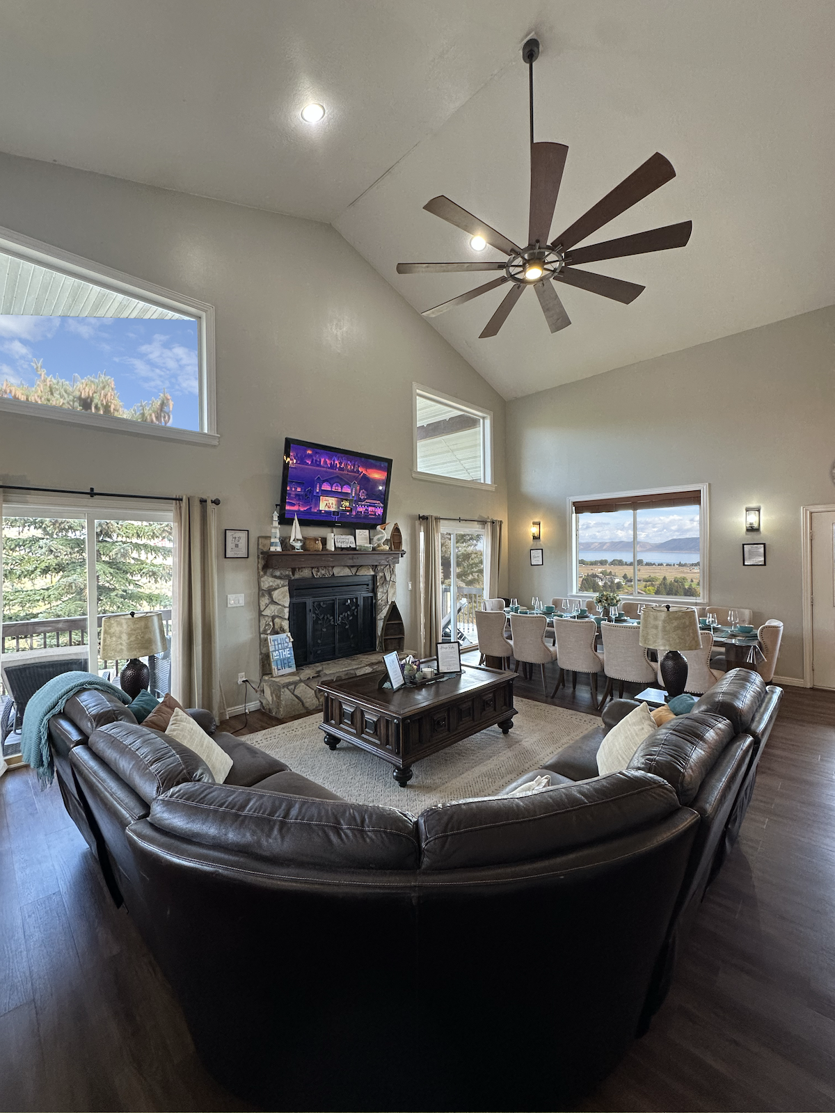 Escape to our Bear Lake family retreat with breathtaking lake & mountain views and a large lawn for games. Designed for family reunions and ideal for up to 4 families (sleeps 19), this getaway features main-floor suites—each with a private bathroom—a game room, wraparound deck with BBQ, and a cozy gazebo with fire pit. Enjoy open-concept living, a fully stocked kitchen, and access to Ideal Beach Resort’s pools and private beach. The place to gather, reconnect, and make lasting family memories.