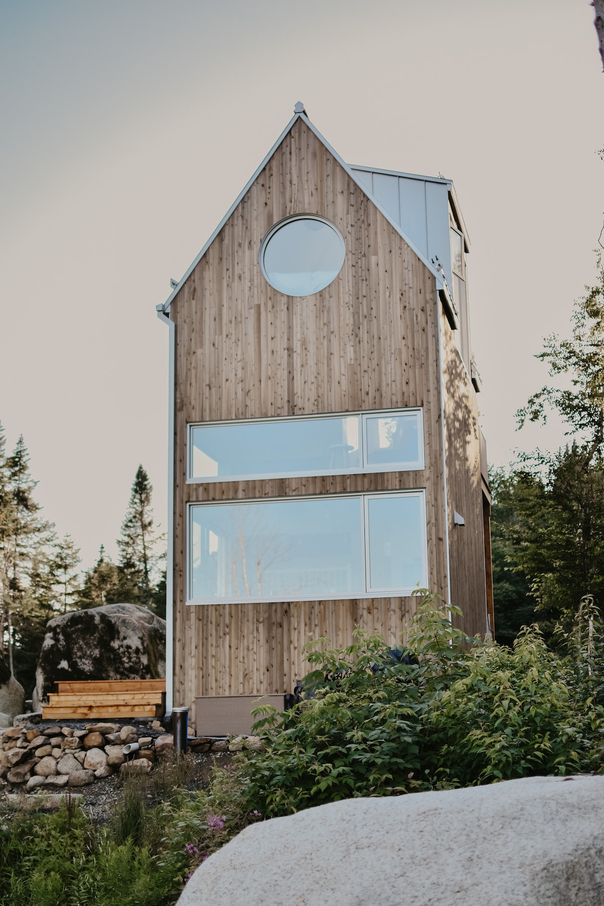 Small Scandinavian chalet for two people ideally located to enjoy the attractions of Charlevoix. It has a thermal circuit (hot tub, sauna, hammam) Very intimate and in the middle of the woods, the view overlooks the majestic river and the mountains in the distance. All the modern equipment is there and the comfort is absolute A/C and outdoor fireplace. The open concept design was designed for an immersive experience in nature: large windows, panoramic shower. Access via a private road at 500 m.