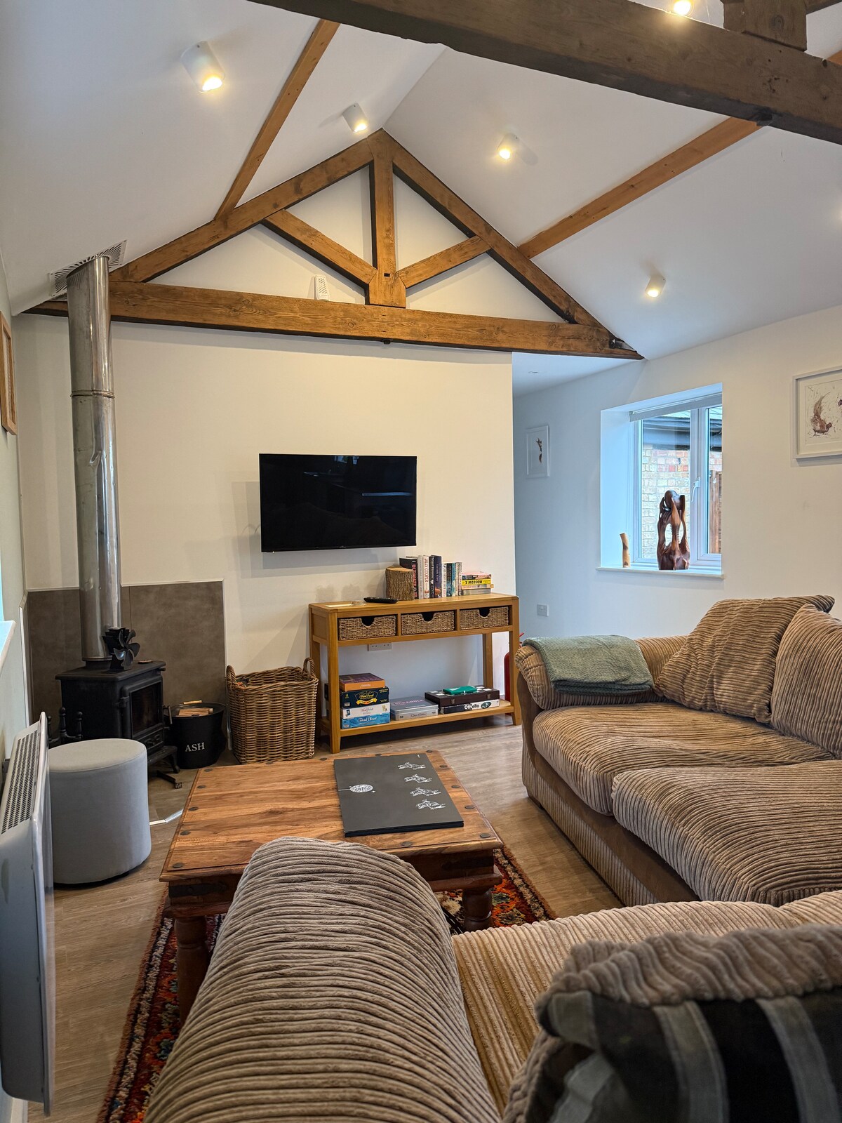 Spacious, characterful and cosy barn conversion next door to our cottage in a lovely rural north Bedfordshire village. A large comfortable living room with log burner and a kitchen stocked with all the food essentials for breakfast including home made bread. The bedroom is spacious and there's a luxury shower room. Private access is via a side gate and separate private entrance. Lovely village pubs and a shop are a short stroll away and lots of other great places to eat are nearby