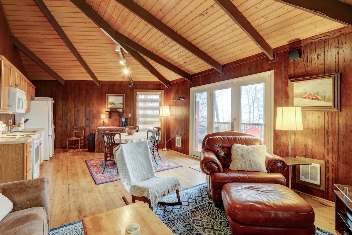 Gorgeously renovated! Stone gas fire place. New stainless steel appliances. New gas fireplace. Walk in shower. Long deck with comfortable outdoor furniture. Big Jacuzzi tub in master on suite. Open kitchen and living room looks out on large deck for privacy. Park 3 cars on flat parking area. 1 free bottle of wine * please note that this cabin is private with wooded views only, and across the street from Beech Mountain Club , convenient for concerts, brewery, mountain biking and skiing.
