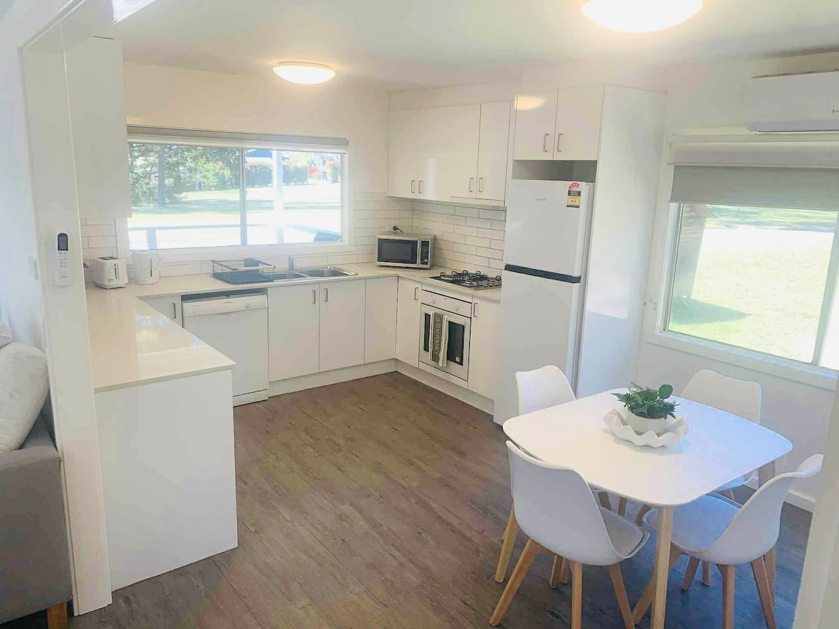 Find peace & tranquility in this sweet & stylish space with views of a lake, forest & farmland. Experience solitude & privacy with only a small distant cottage in sight. Swim in the river, see the stars at night, Roos at dusk & dawn and a few cows. It is off-grid with solar power and water must be carted in. For the hot days there is an air cooler ( no Aircon), it always cools down at night. No heater inside but it is never too cold in winter. Firewood provided. Cooking on bbq outside! 😊