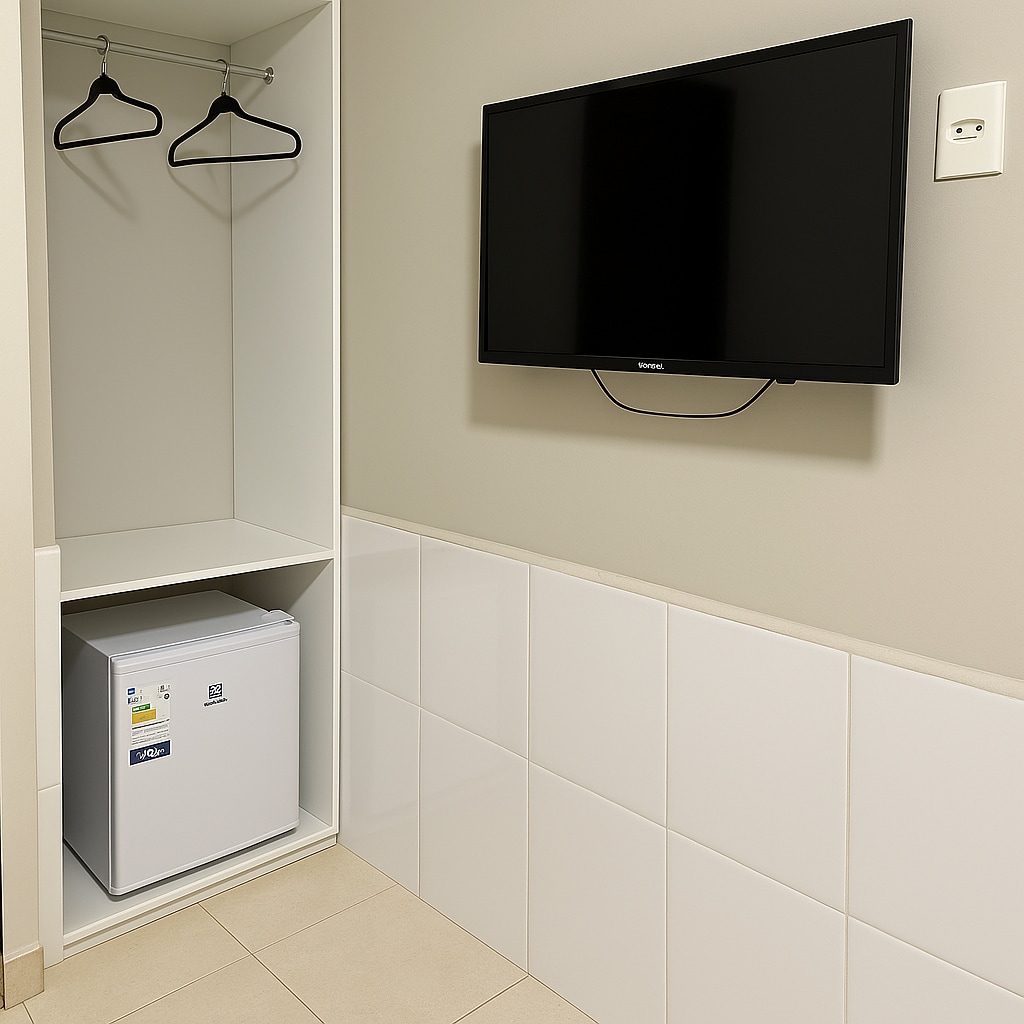 Independent accommodation with easy access to everything you need in this place with an excellent location. Close to the city's main tourist attractions. Space with suite, living room and balcony, accommodating up to 8 people. The living room has a large sofa and a 65-inch smart TV with integrated Wi-Fi.