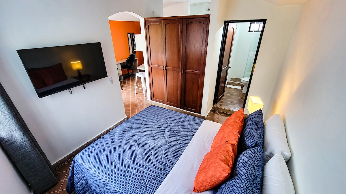 🌴 EXSTR APARTMENT • Villa del Peñon 301 This two bedroom, two bathroom unit with a balcony, is the perfect match for families, groups of friends, or digital nomads. All tabs have hot water, the bedroom has A/C, smart TV, and a queen bed. All the amenities are in place and have been designed with your comfort in mind. The El Peñon neighborhood is a very walkable area with plenty of restaurants and entertainment within minutes. Colonial San Antonio is only 3 blocks away.
