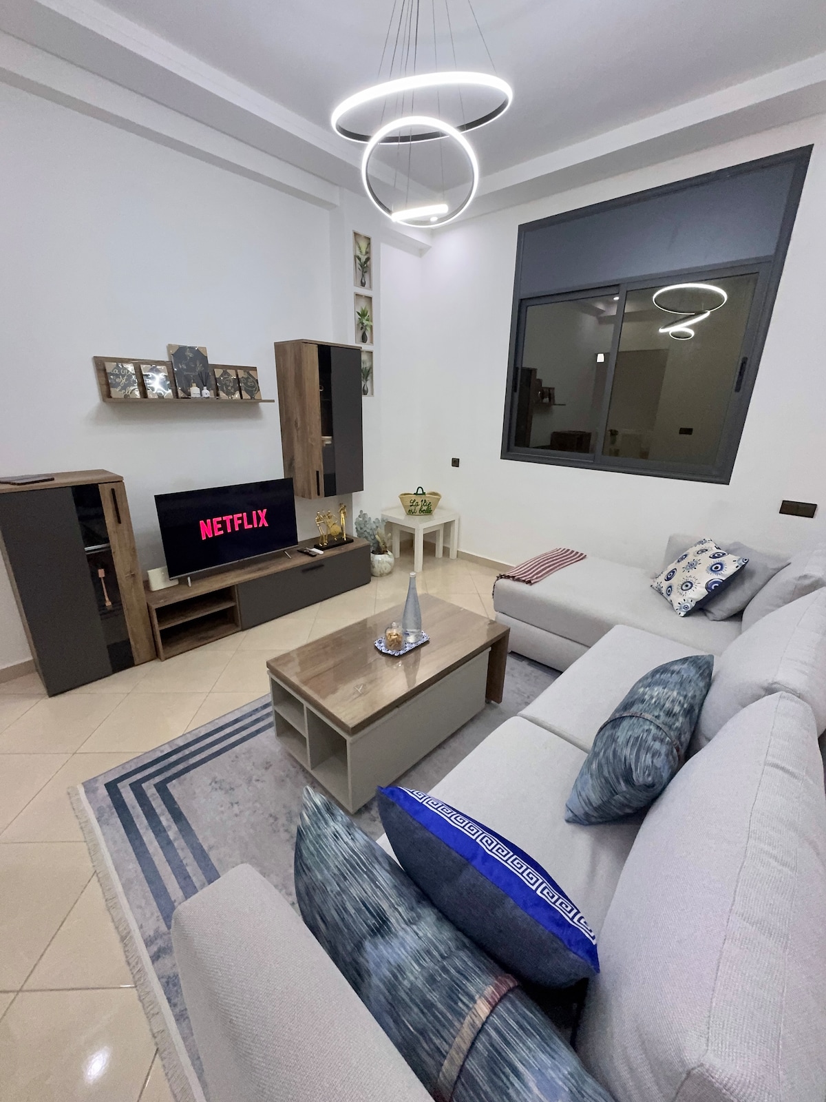 Enjoy a modern ground floor apartment, well equipped with fiber optic WiFi, 60”TV, electric water heater, and a kitchen equipped with coffee machine. Located in a quiet area, 5 min drive from UM6P. Perfect for business travelers, students, and interns. Book now for a comfortable stay. ⚠️ Important rule: Unmarried couples are not accepted.