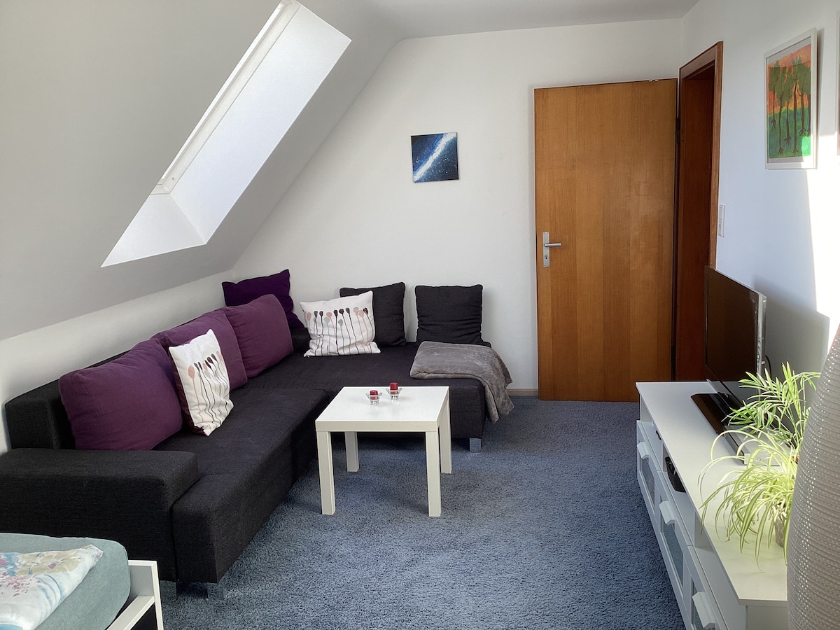 This beautiful apartment is located directly below the vineyards in Auerbach and is ideal as a starting point for hikes or Montain bike rides to the charming surroundings. It consists of a room with integrated kitchenette and an adjoining large bathroom with shower and bathtub. For relaxing, the large terrace facing back serves as a view of the countryside. This apartment is in the same house as the "Pretty guest room with bathroom/kitchen".