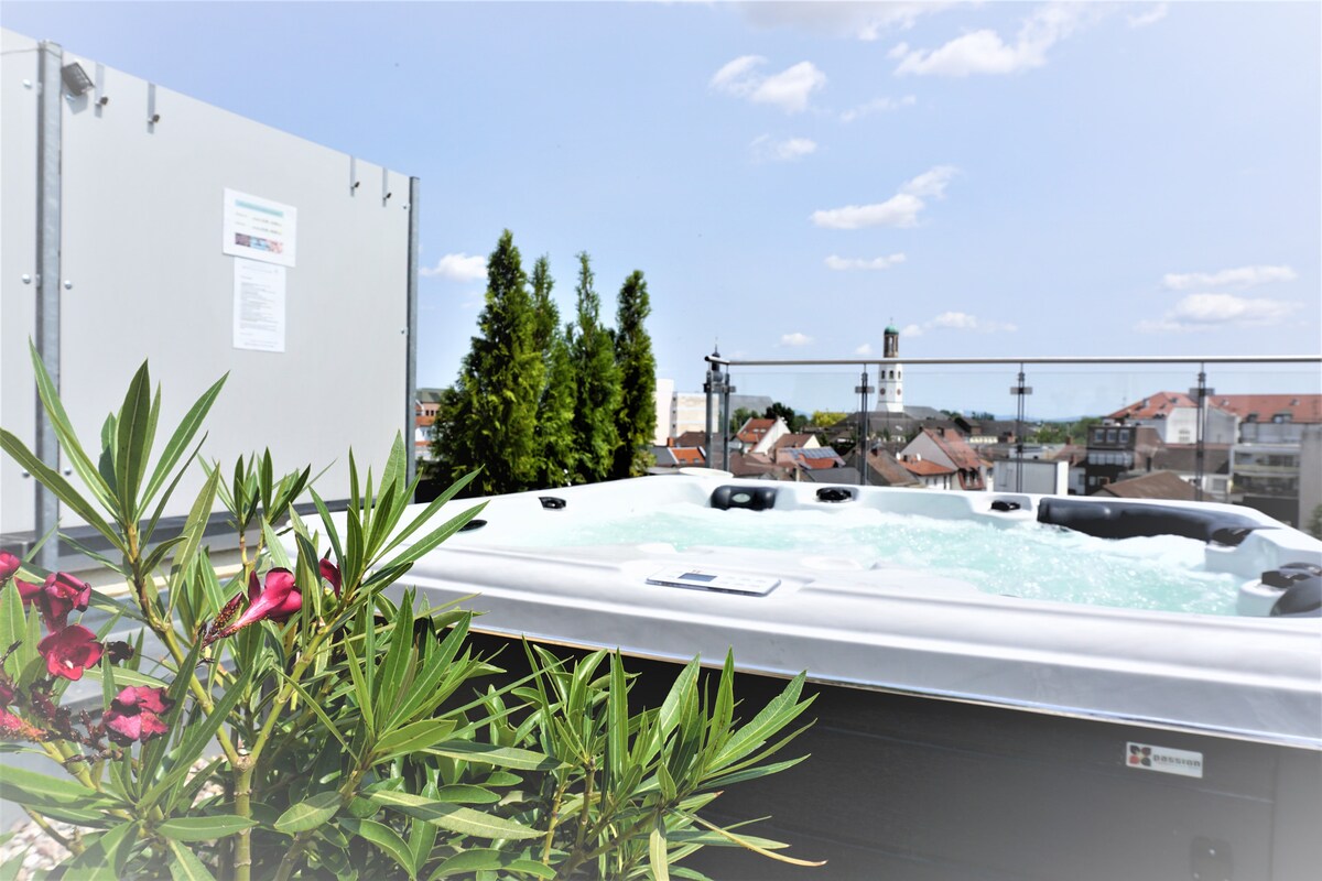My apartment: Panorama penthouse with heated and LED-lit terraces whirlpool under the open sky with a view of the Palatinate Forest, Odenwald, for up to 6 people, 3 sleeping areas, 110 m2. Whether it's temporary living, a holiday, a voyage of discovery, an engineer's apartment or an upscale assembly stay. Here you will find more than "just" standard. Welcome to Mein Apartment: Panorama penthouse apartment with terrace and whirlpool (Jacuzi).