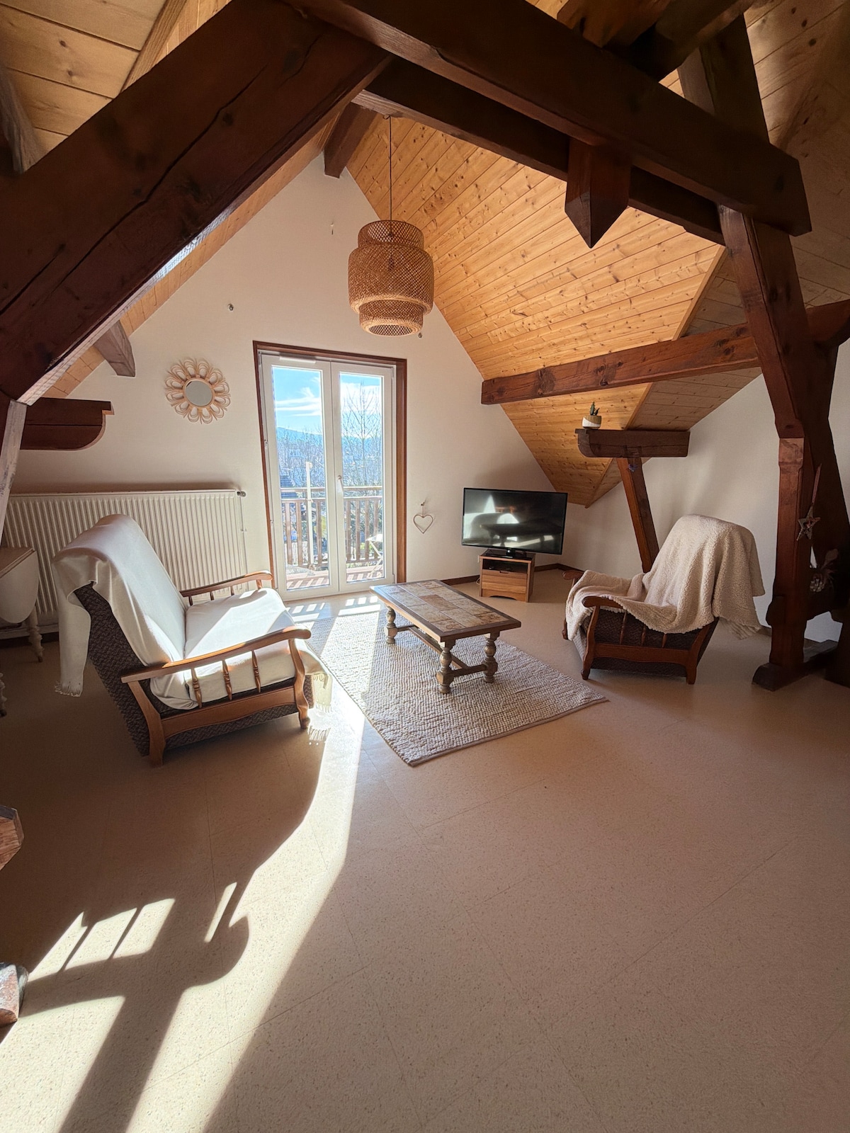 Stay with family, as a couple or solo in this beautiful A-frame cottage, A-frame house type with magical views of the mountains. Relax in this atypical and quiet place, with unusual architecture. Enjoy sunrise and sunset on the mountains from your terrace or comfortably installed on your bed, in your panoramic room, upstairs. The perfect base to enjoy your stay in our beautiful Vosges region.