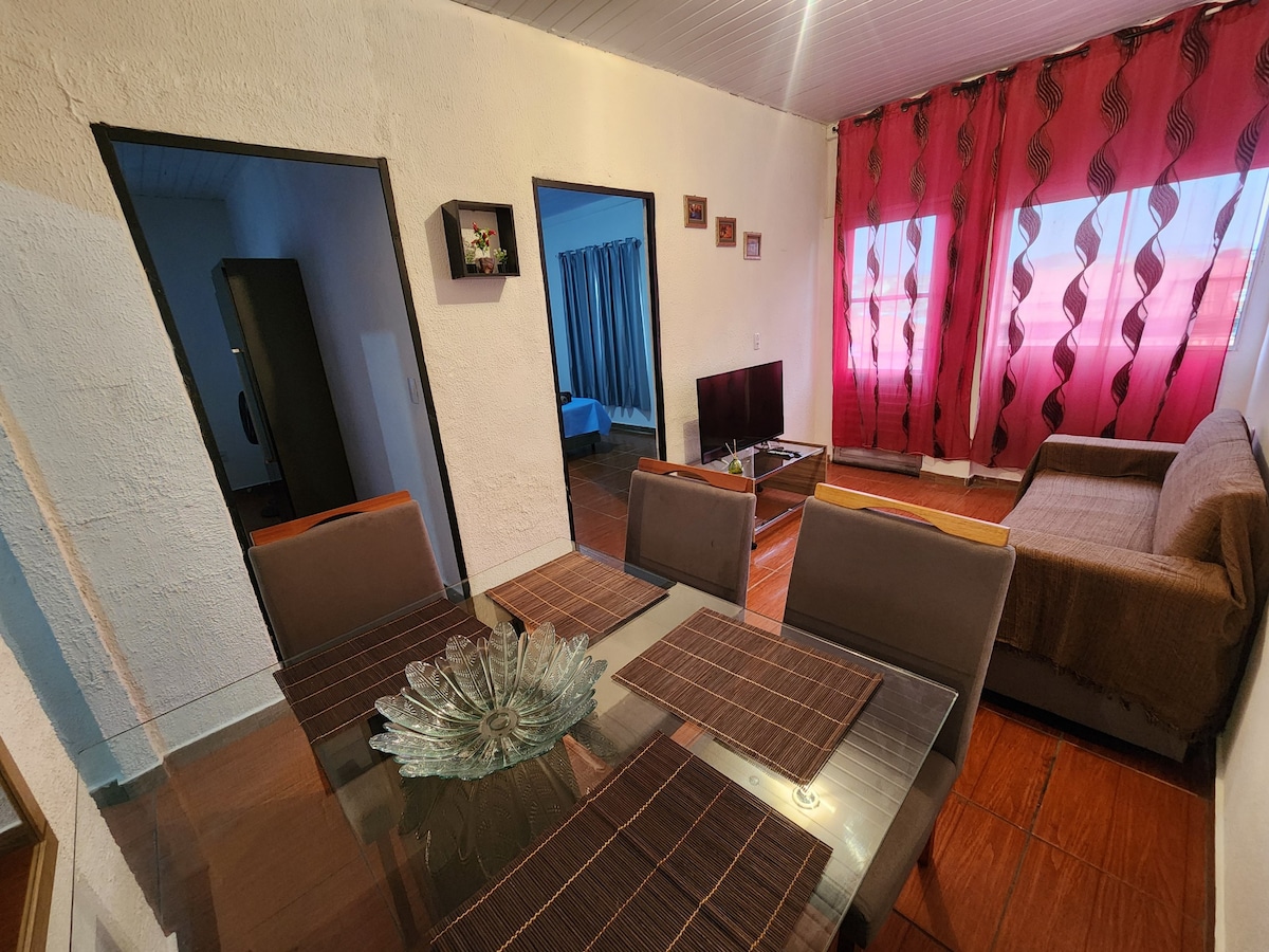 The space comfortably accommodates up to 5 guests. 2 Bedrooms: Room 1: double bed and fan Bedroom 2: 2 double beds + wardrobe + fan The living room is inviting and has a Smart TV to relax after a day of work or sightseeing. The kitchen is equipped with the basics for your meals. Kitchen equipped with all the necessary utensils for the stay. 1 WC. 1 parking space. {Note: only for small/medium cars}. Close to several shops, a perfect place to rest.