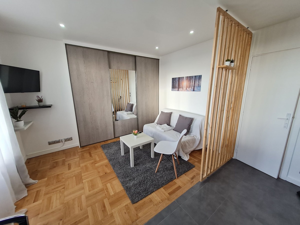 Quiet 20 m2 studio. Located on the outskirts of Paris. Close to the Stade de France and the flea market. A living room with fitted kitchen. A bedroom/sleeping area with storage closet. Bathroom with toilet (Sanibroyeur). This is a small space that we have tried to make pleasant at an affordable price. Don't hesitate to contact us for an early check-in or late check-out. Hours can be extended to make your stay easier and more comfortable.