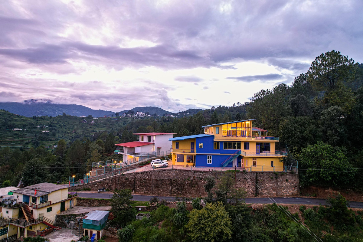 Perched on a peaceful hillside near Bhimtal within an estate, this hillside stay combines natural charm with modern comfort. With scenic views, it features a king-sized bed, wooden interiors, and a 32” TV; it’s designed for relaxation. Guests can savour sunset & sunrise vistas, unwind on the lawn with a BBQ & bonfire, or enjoy meals at the in-house dining. Close to Chota Kailash Dwar, trekking trails, Naukuchiatal (11.4 km) and the paragliding site (8.3 km), perfect for calm and adventure.