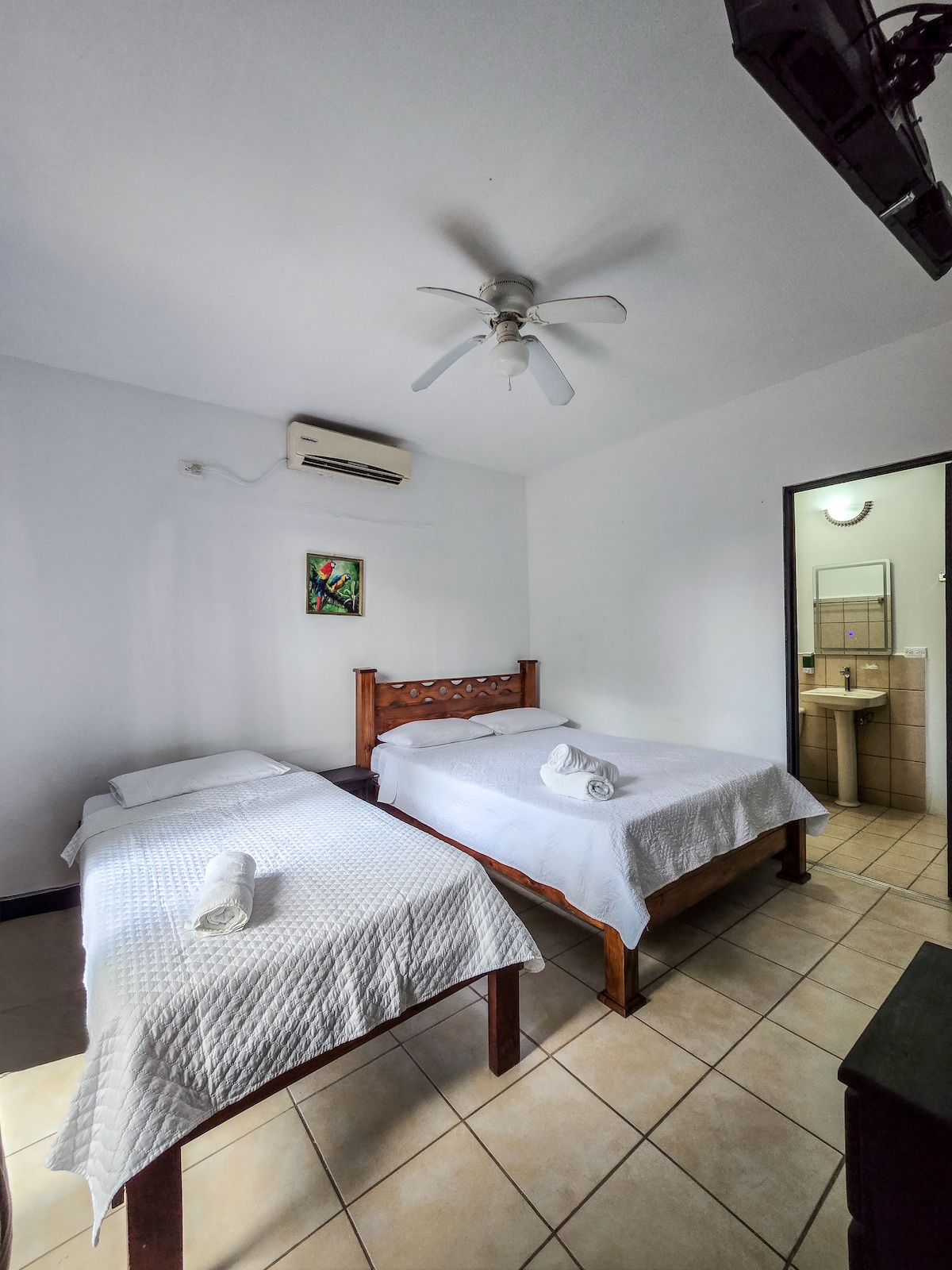 Enjoy a spacious room with a queen bed, a twin bed, a cozy lounge chair, free homemade breakfast, and a free guided park tour (tickets not included). Perfect for small families or friends, this room offers comfort and convenience with a private bathroom and private parking. Step out onto the shared balcony to sip your morning coffee while monkeys play in the trees and colorful macaws fly overhead. A peaceful jungle stay just minutes from the beach and Manuel Antonio National Park.