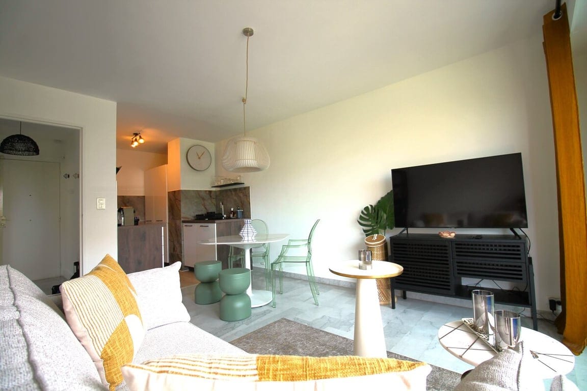 Perfectly located to participate in the Film Festival. 2-room apartment refurbished April 2023. Direct access to Croisette beach from the residence and 1 minute from the beaches of Moure Rouge. Unobstructed view of hills and sea views. Accommodates 4 people max. Caretaker present 24/7. Overlooking the typical Place de l'Étang and its charming restaurants in a village atmosphere with pétanque in the heart of the city. Great for conferences or vacation.