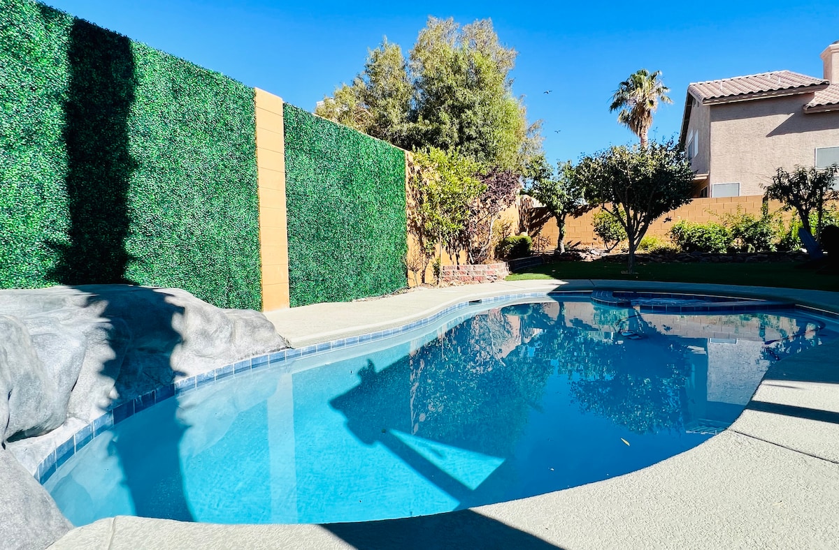 Looking for the perfect home to accommodate your group? Look no further; our sunny oasis awaits! Our spacious home, nestled in the Henderson neighborhood just outside Las Vegas, is the perfect group getaway. You can take a trip up to the Strip, or enjoy our sparkling swimming pool, multiple Smart TV's with major streaming sites, and BBQ in our private backyard. Surrounded by stunning golf clubs and restaurants, our beautiful three-bedroom home was intentionally designed for you!!