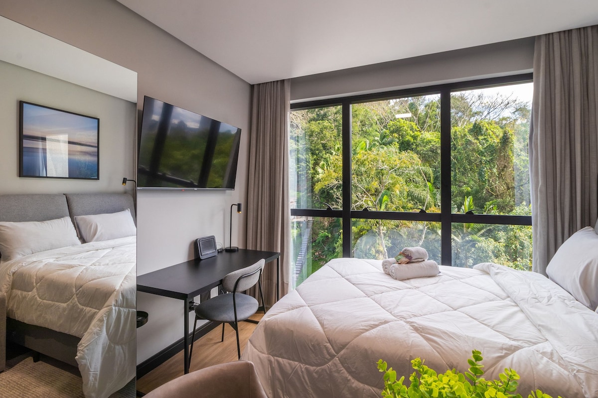 Modern and complete studio for up to 2 guests, located in the heart of Blumenau: 300 meters from Vila Germânica! Complete condominium with swimming pool and fitness center on the terrace, shops on the ground floor and access via self check-in with QR Code. The space is modern, designed for a unique and practical stay. We have fast WIFI, parking space and bed and bath linens. We will be happy to welcome you to our space!