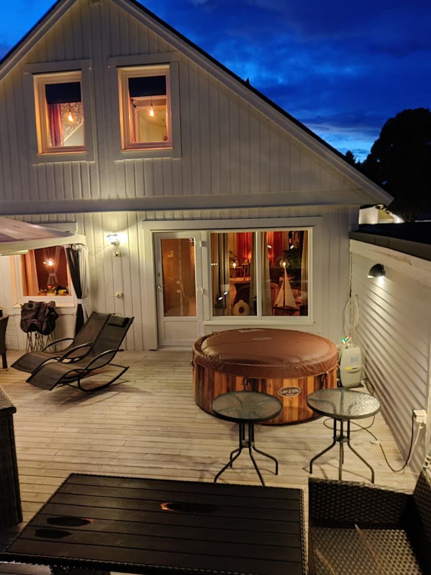 Live 5 km from Luleå city center in this modern villa in Hällbacken. Ground floor: -Pleasant outdoor patio -Modern fully equipped kitchen -Bathroom, washer/dryer -Living room -Bedroom King Size bed Upper floor: -Living room with a view over Björkskatafjärden -Bathroom/Sauna -2Bedrooms -Outdoor Hottub area(shared) Public transportation with connections to city, Walking/biking distance to Björksgatan center. Bicycles available to borrow. 5km to the University. 30minute drive to Stegra.