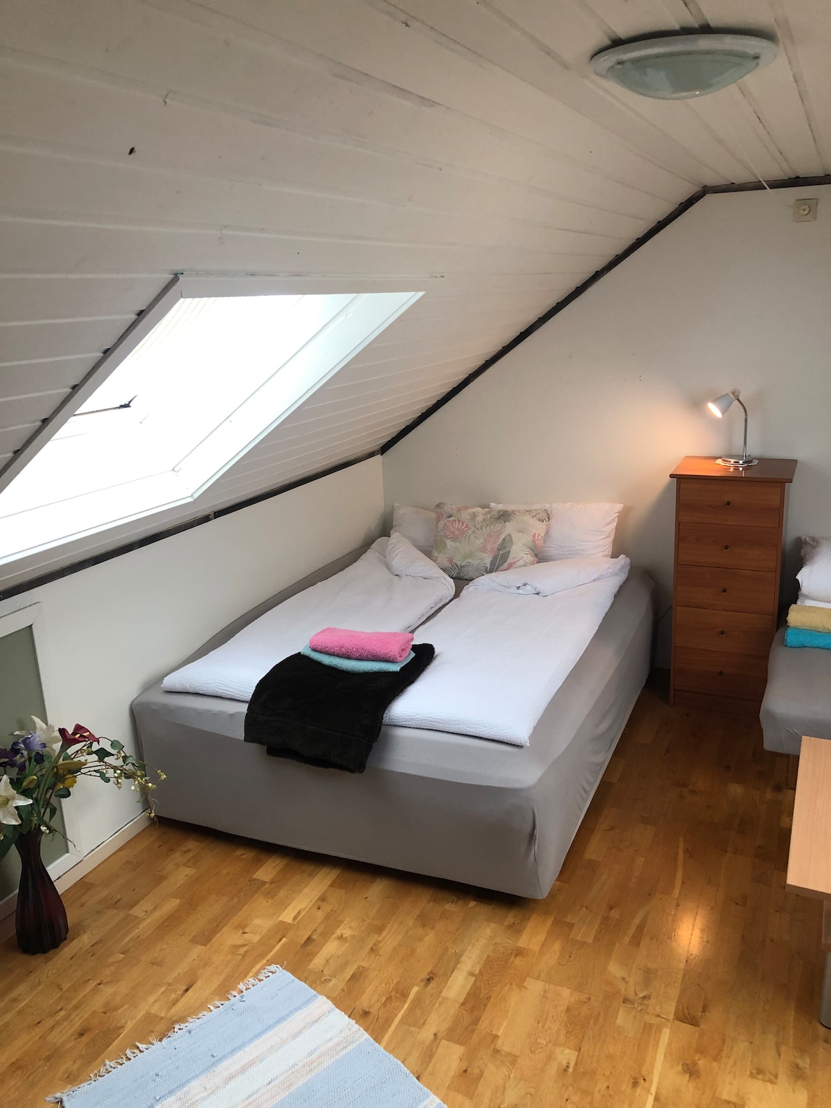 Velkommen til oss. Vi leier ut ett soverom til de som ønsker å besøke Bodø. Vi leier gjerne også ut på ukesbasis til feks studenter eller ansatte ved Nord universitet. Huset ligger i et hyggelig boligstrøk med flott utsikt. Det tar ca 15 min å gå til universitetet, treningssenter, tog, matbutikk, kjøpesenter. I umiddelbar nærhet finner du stier lysløyper og buss til universitetet eller sentrum av Bodø. Sengen og rommet egner seg for par, eller de som kommer alene.