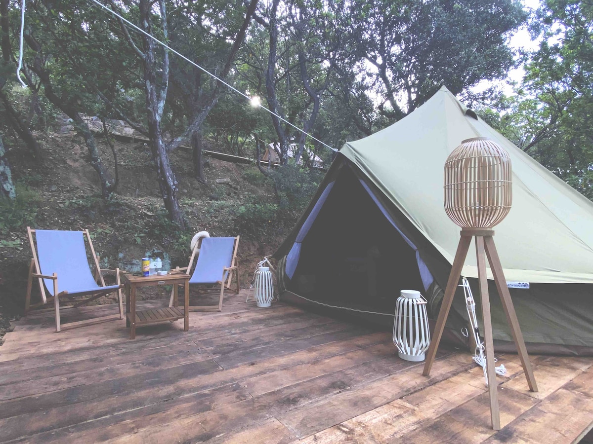 In the middle of nature with sea view this gorgeous Glamping tent of 25 squares meters King bed organics sheets and Towels Bohemian chic inside Shower and bathtub outside with water from the source Kitchenette for breakfast + fridge Relax area tables and lounge Like 5 stars resort More photos are coming soon