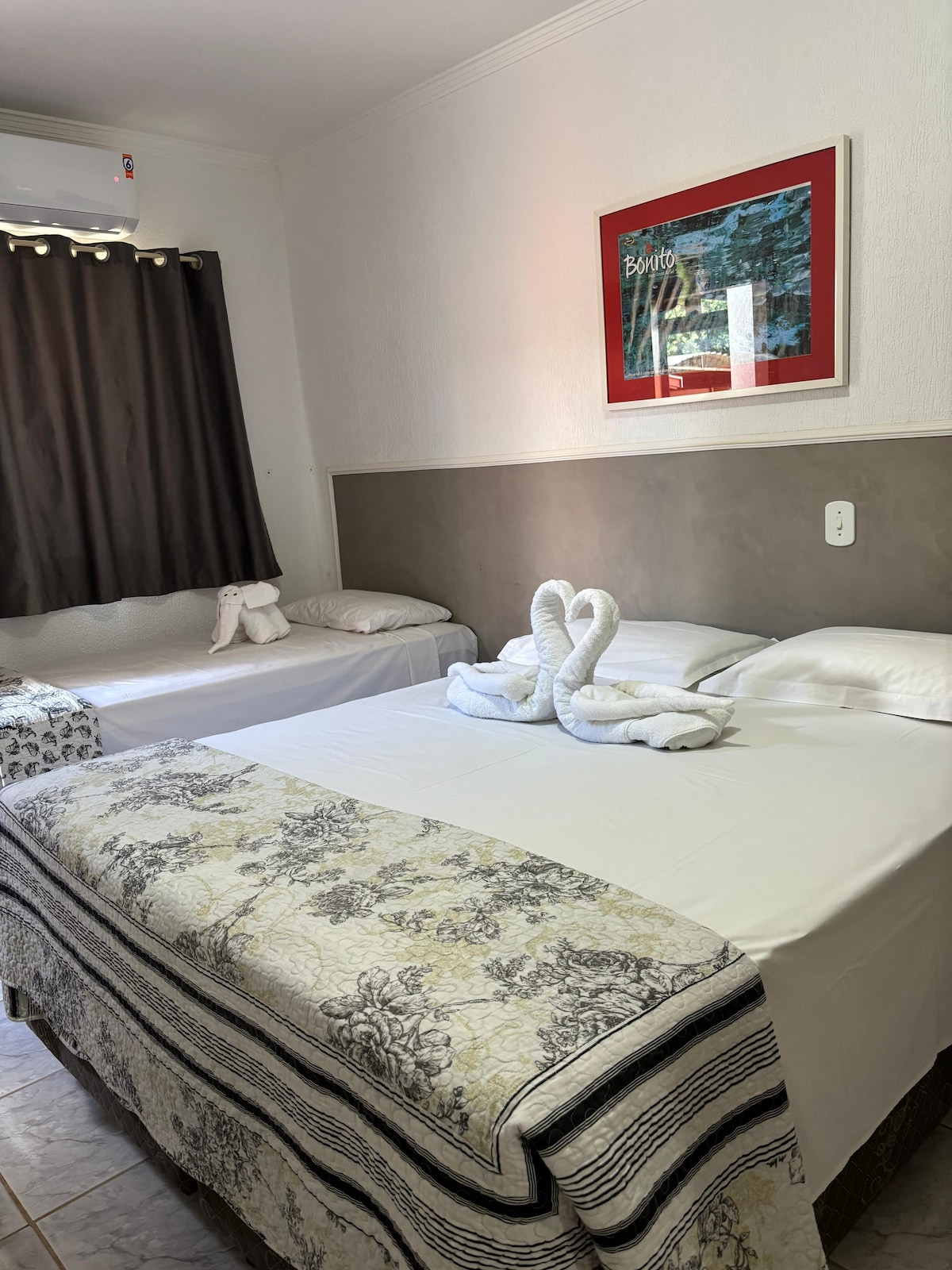 Our house is quiet and well located. It is in a horizontal condominium, about 5 blocks from the center of Bonito. It has 2 air-conditioned bedrooms, a bathroom, a living room with ceiling fans, and a kitchen well equipped with all the usual appliances (refrigerator, gas stove, microwave, airfryer, sandwich maker, electric coffee maker and blender). It also has a laundry with a washing machine, sink and clothesline, as well as an open private backyard with benches and a small table.
