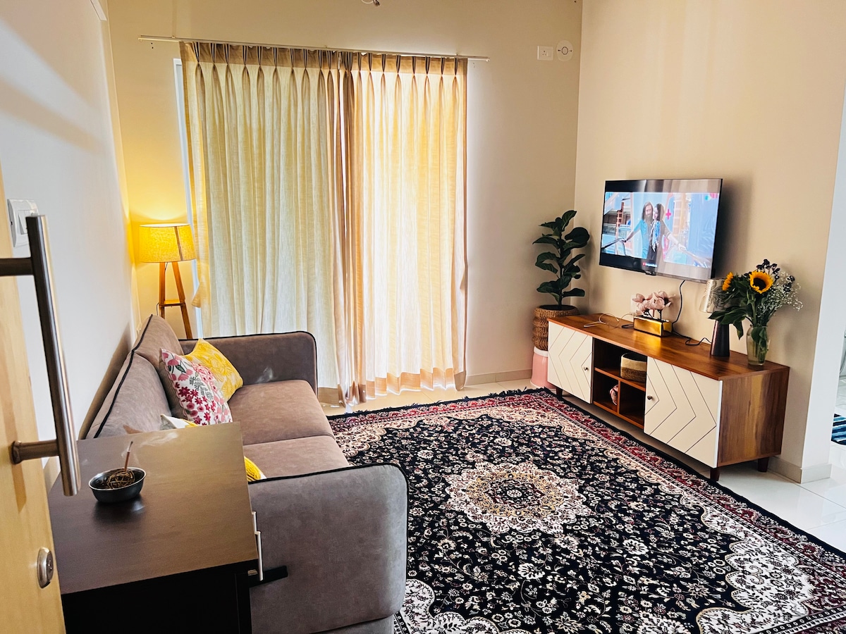 Welcome to our brand-new, spacious 2-BHK apartment, ideal for families and couples seeking comfort and convenience. The bedrooms have queen size beds with orthopedic mattresses and AC for a restful night's sleep. Relax in the large living room with a 43-inch Smart TV, lightning-fast WiFi and a dedicated dining area. Comes with two super clean bathrooms stocked with bath essentials. The fully equipped kitchen includes high-quality appliances and crockery for your culinary adventures!