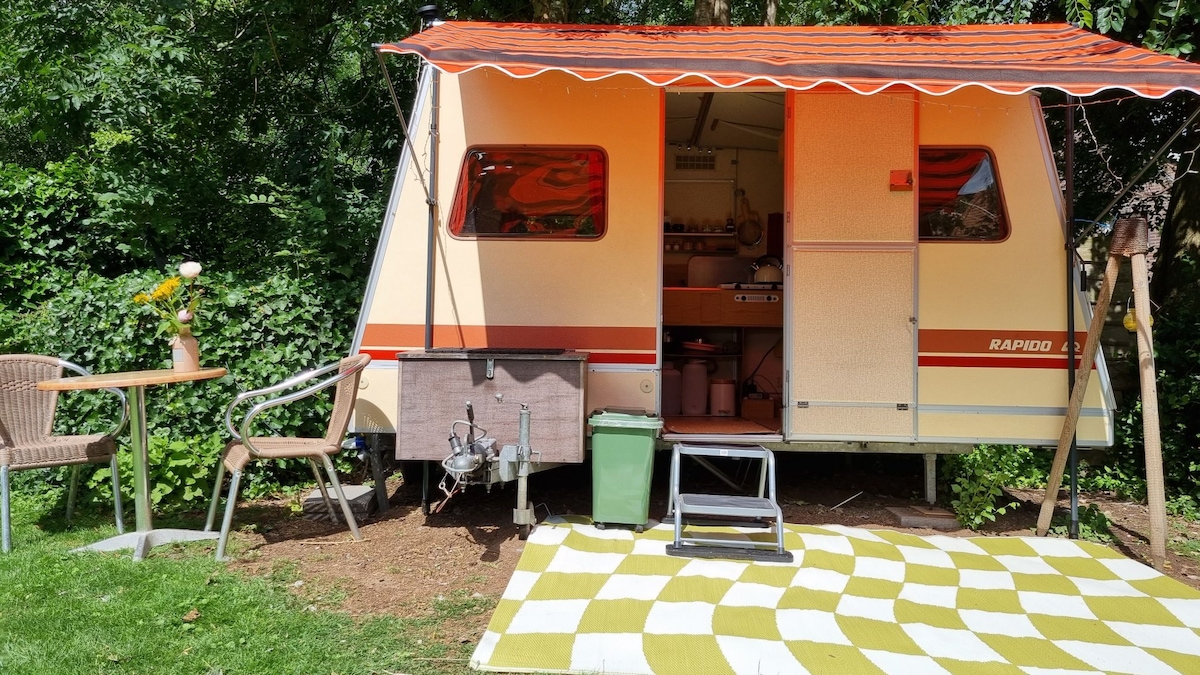 In the Rapido folding caravan, you can completely relax. It has a 140x190cm bed. A water tap and 2 electric hobs. The toilet is in the nearby building. No shower. Maximum 2 nights. Near the boat to Schiermonnikoog. 25 minutes from the city of Groningen and half an hour to Lauwersmeer National Park. Close to the Pieterpad. On a quiet, spacious and green yard with peacocks, chickens, ducks, goats, cats.