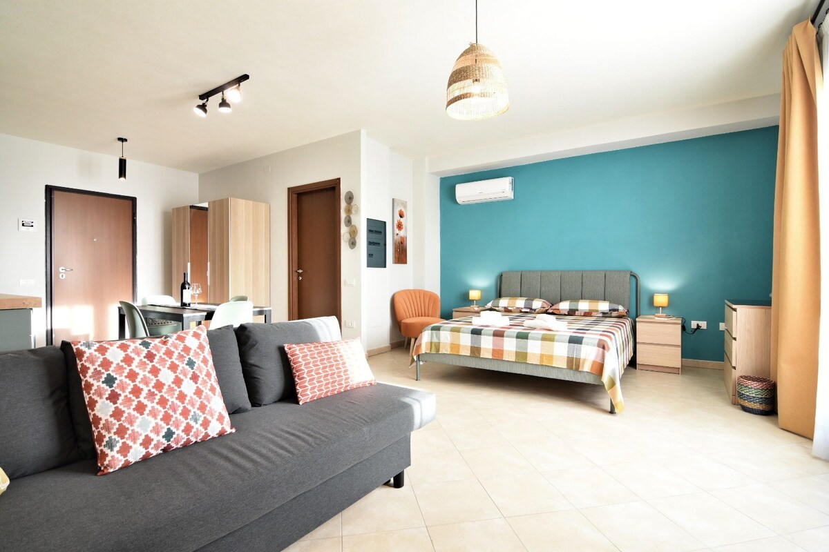 Bright and cozy newly built flat, just a few minutes walk from Bosa Marina beaches. The studio is very roomy and offers all the comforts to ensure a relaxing stay: queen size bed, sofa bed, reading area, desk, large kitchen; air conditioning, tv and wi-fi. The very quite location is surrounded by greenery and guests will have large covered veranda, garden for exclusive use, reserved parking inside the property.