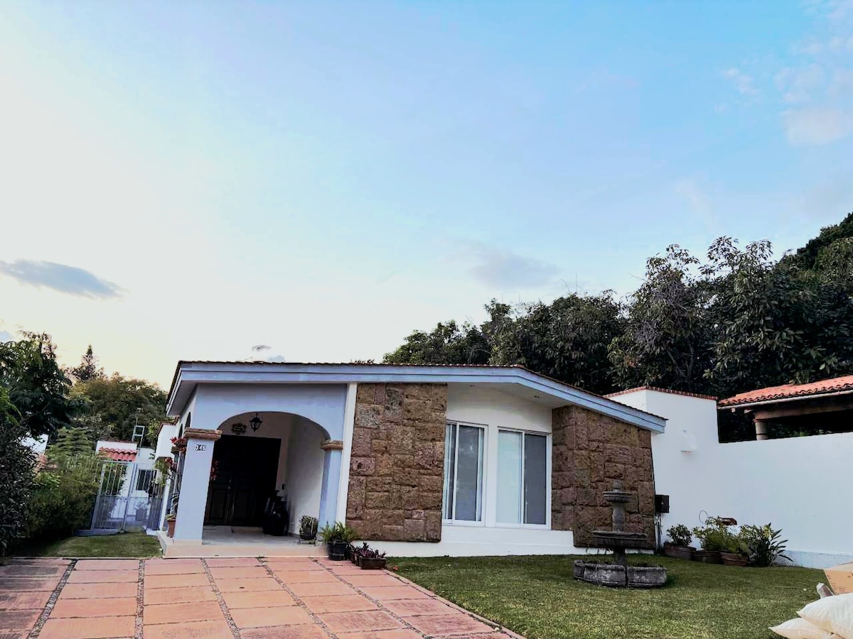 Casa tipo Hacienda Con chimenea, un área de jardín muy amplio, donde sentiras La Paz de de la naturaleza, y podrás disfrutar de tardes con tus hijos y o carne asada con amigos y los niños pueden jugar y correr También contamos con alberca de 5 x4 tibia en meses cálidos fría en invierno WiFi, balcón con hamaca para disfrutar la vista Ideal para desconectarte de la ciudad. si estás cansado o estresado es el lugar indicado Estamos cerca de la barranca y zoológico de Guadalajara