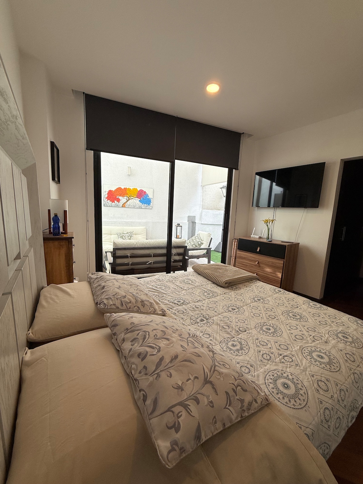 Modern and independent suite with parking, in the north-central part of Quito, located in a modern building and quiet residential area. It has legal operating permits and an excellent location, close to shopping malls, the financial area and La Carolina Park. It has a bedroom with a queen size bed, a workspace, a full bathroom, an equipped kitchen, a dining room, internet, Netflix, Magis TV, books and parking in the building. Cleaning service available for an additional fee.