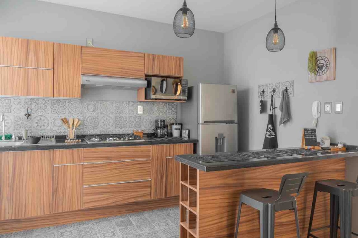 This is a lovely loft for two, located just a few steps from the Historic Center of San Luis Potosí. It has a private entrance and everything you need: a fully equipped kitchen, full bathroom, WiFi, TV screen, a small private patio with a hammock, amenities, excellent lighting — and plenty of inspiration!