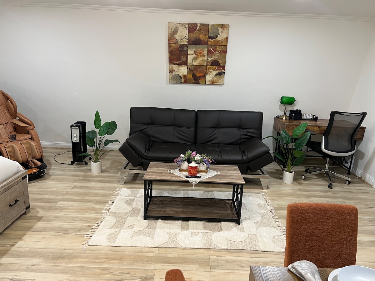 Welcome to our dreamy, San Diego-inspired private petite suite. The studio has its own entrance and perfect for solo travelers or couples. Nestled in a quiet and secure neighborhood, it’s centrally located, near shops, restaurants, and with convenient access to all major attractions. Enjoy complimentary coffee, snacks, and tea, get inspired by our quote wall, relax with a book in the floral tiny patio. This space offers a perfect blend of comfort and style, with all you need for a relaxing stay!