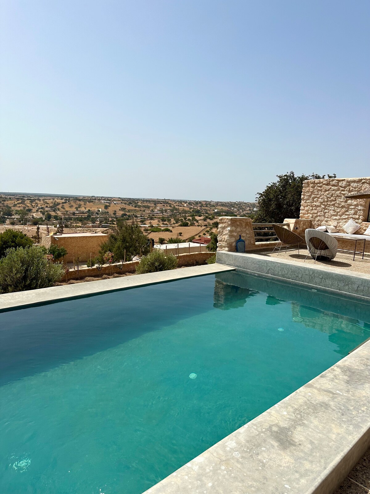 Luxurious villa not overlooked, nestled in the countryside 20 minutes from Essaouira, famous for its beach-style pool heated from November to April. Its memorable sunsets and accessibility to people with disabilities make it an exceptional place. Discover a luxurious, comfortable and stylishly appointed space. The bright living room offers a perfect setting to relax, with an automated canopy for a smooth transition between indoor and outdoor.