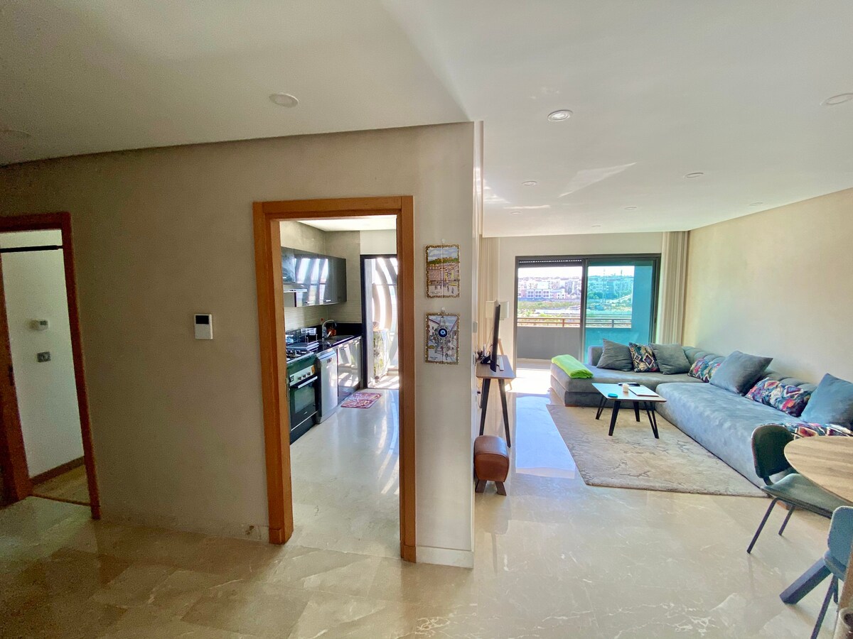 Perla 403 💎, a haven of peace where the elegance of a modern residence is combined with the comfort of 5-star hotels in the heart of Casablanca! Relax in a spacious living room with a modern design, equipped with a 55" Smart TV with Netflix and IPTV for evenings of absolute relaxation. The bedroom, a real cozy nest, promises peaceful and restful nights ☁️ From your private balcony, admire the splendid sunsets over the city, making every moment of your stay unforgettable! ✨